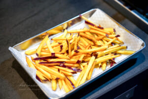 フライパンに油を1cmほど入れ、中火で加熱。(160〜170℃)さつまいもを5〜6分ほど、じっくり揚げ焼きする。