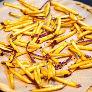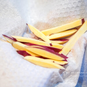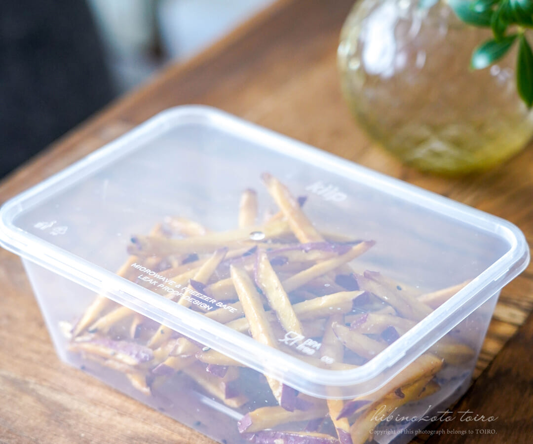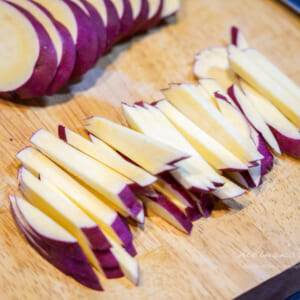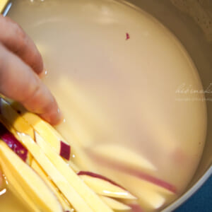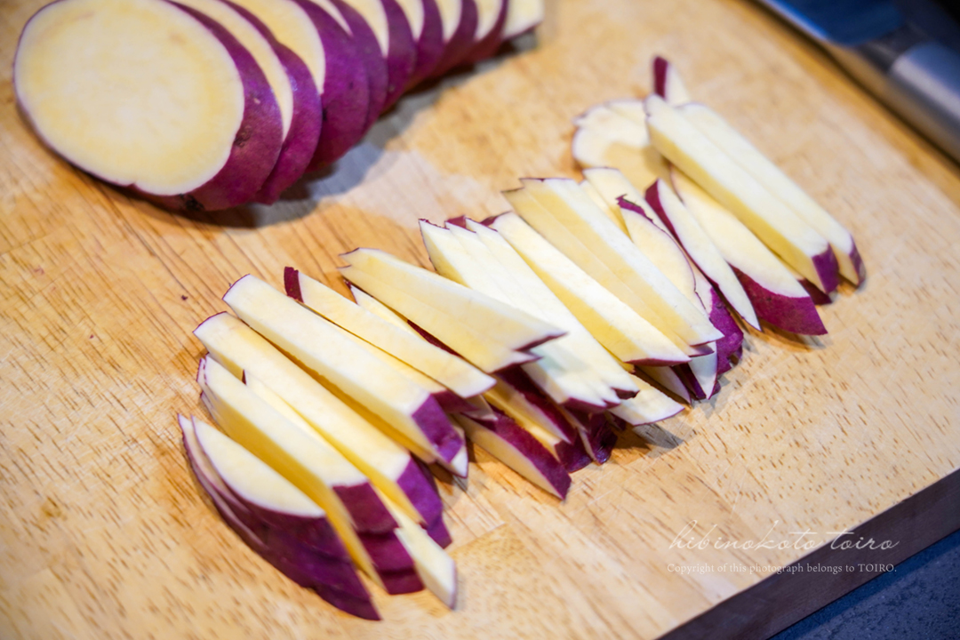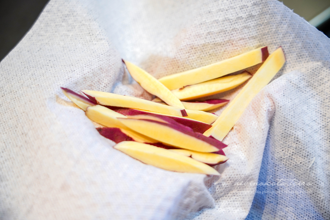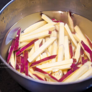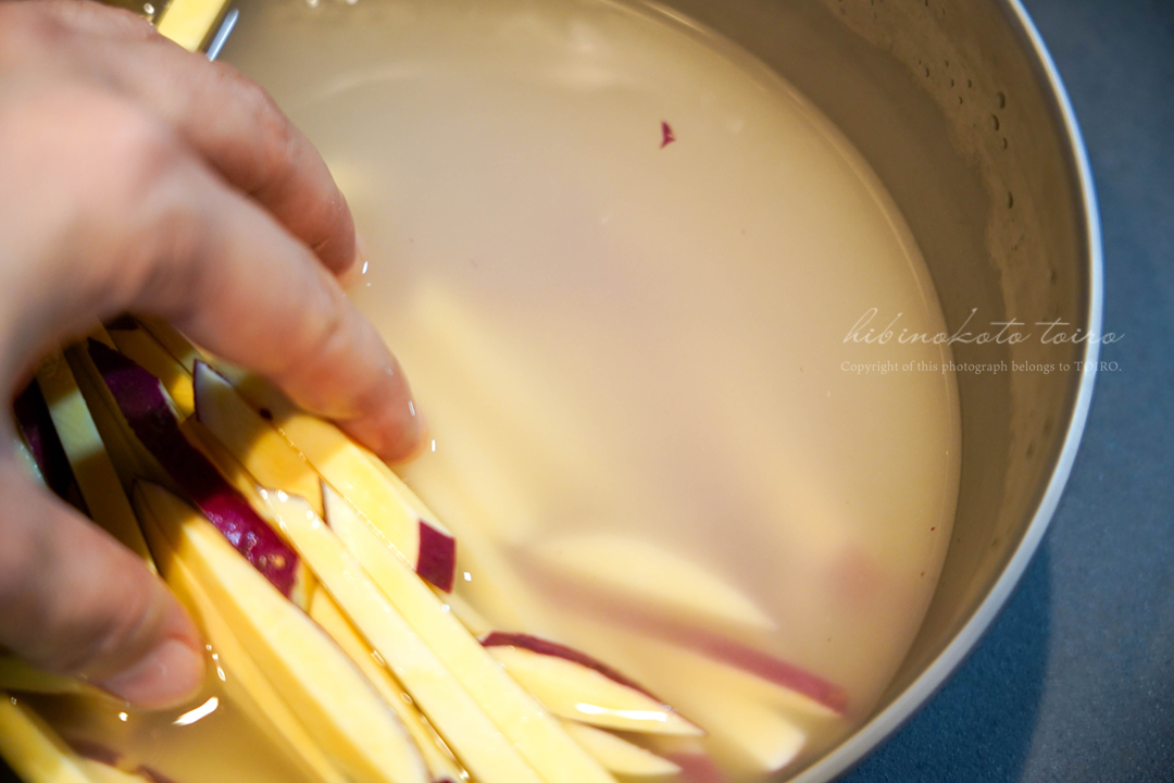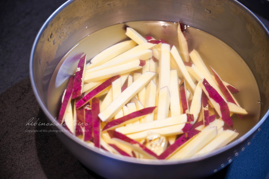 さつまいもは皮をよく洗い、5mmの細切りにして、水が白く濁らなくなるまで数回サッと水洗いしてから10分さらす。
