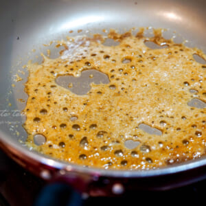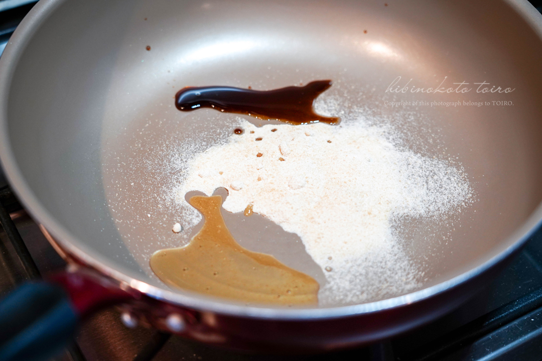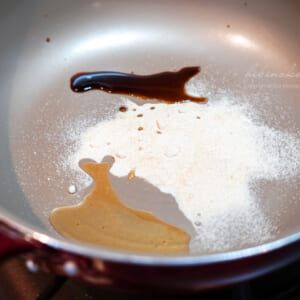 別の鍋で砂糖・醤油・はちみつを入れ、弱火で煮詰める。泡が小さくなってとろ〜っとしたら火を止める。