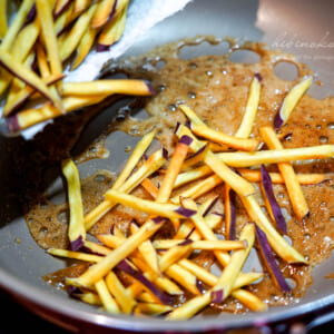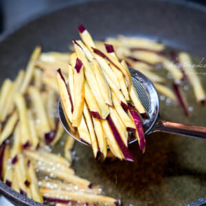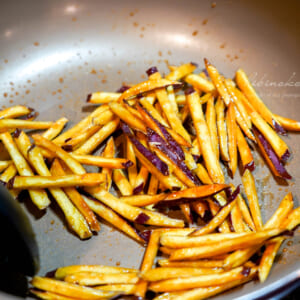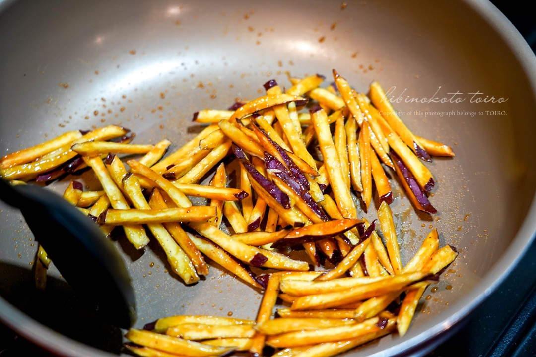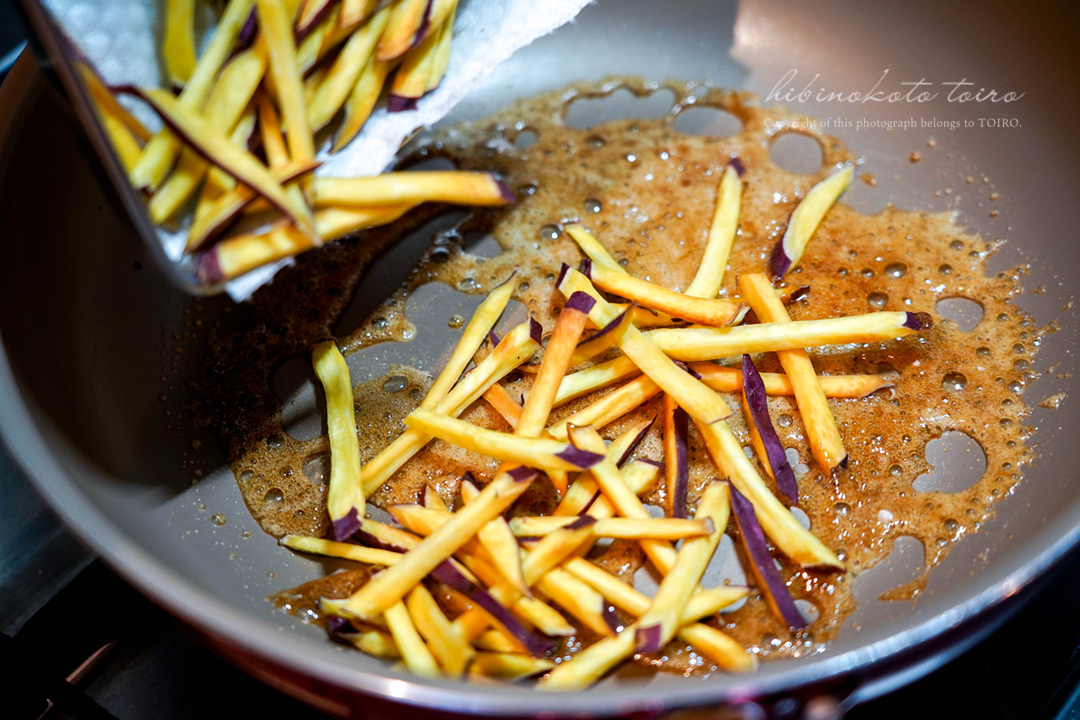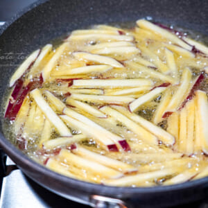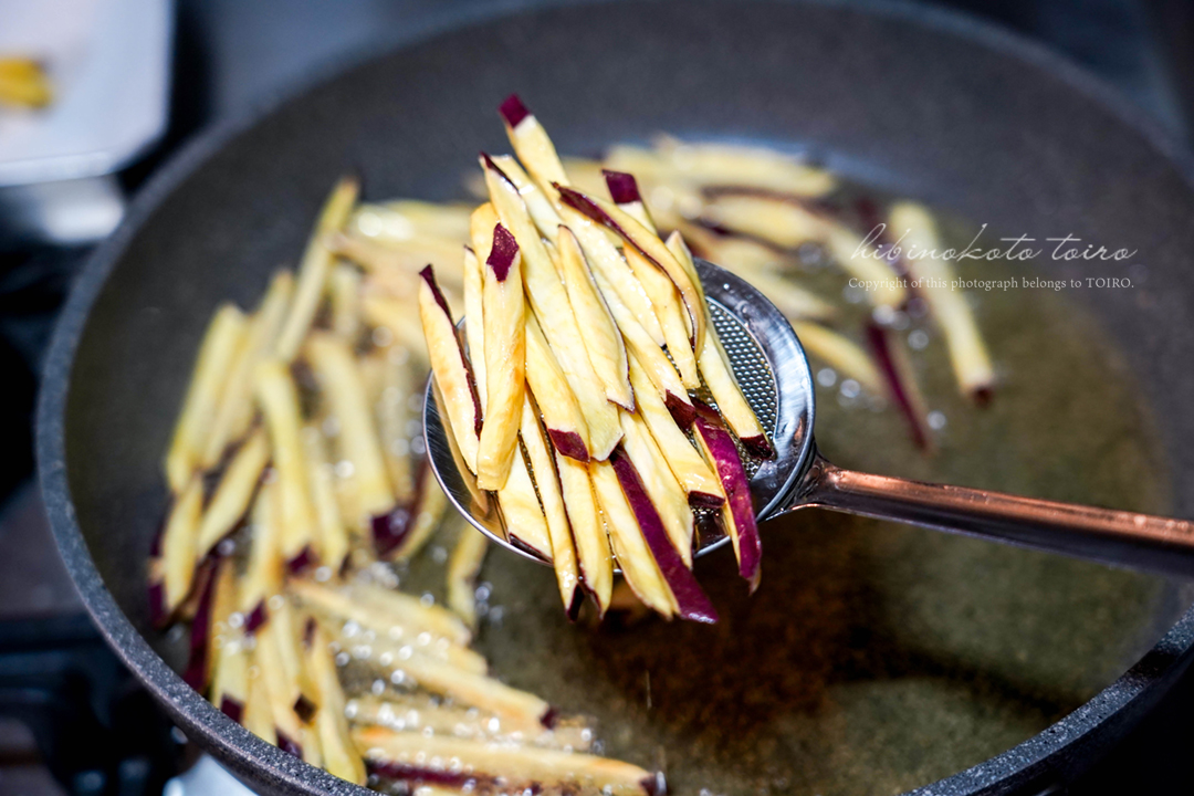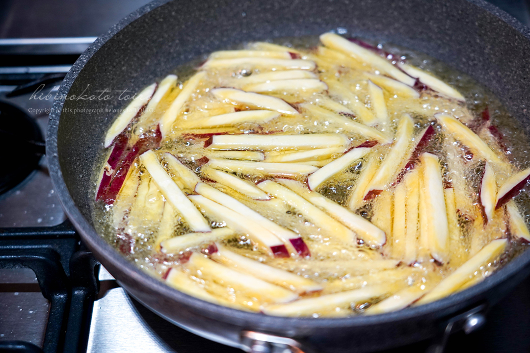 フライパンに油を1cmほど入れ、中火で加熱。(160〜170℃)さつまいもを5〜6分ほど、じっくり揚げ焼きする。
