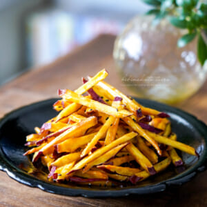 さつまいも(紅はるか)で食べる手が止まらなくなるカリカリのかりんとう風のスティックを作ります。細切りにしたさつまいもを素揚げして蜜にからめるだけ♪噛むほどにさつまいもの甘みと旨みが口の中に広がって、ホントに食べ出すと止まらないんです。子どもから大人まで、みんながきっと好きな味。甘塩っぱさを楽しんでください◎