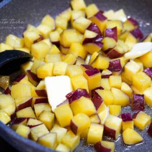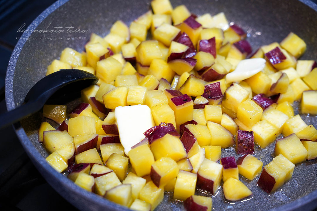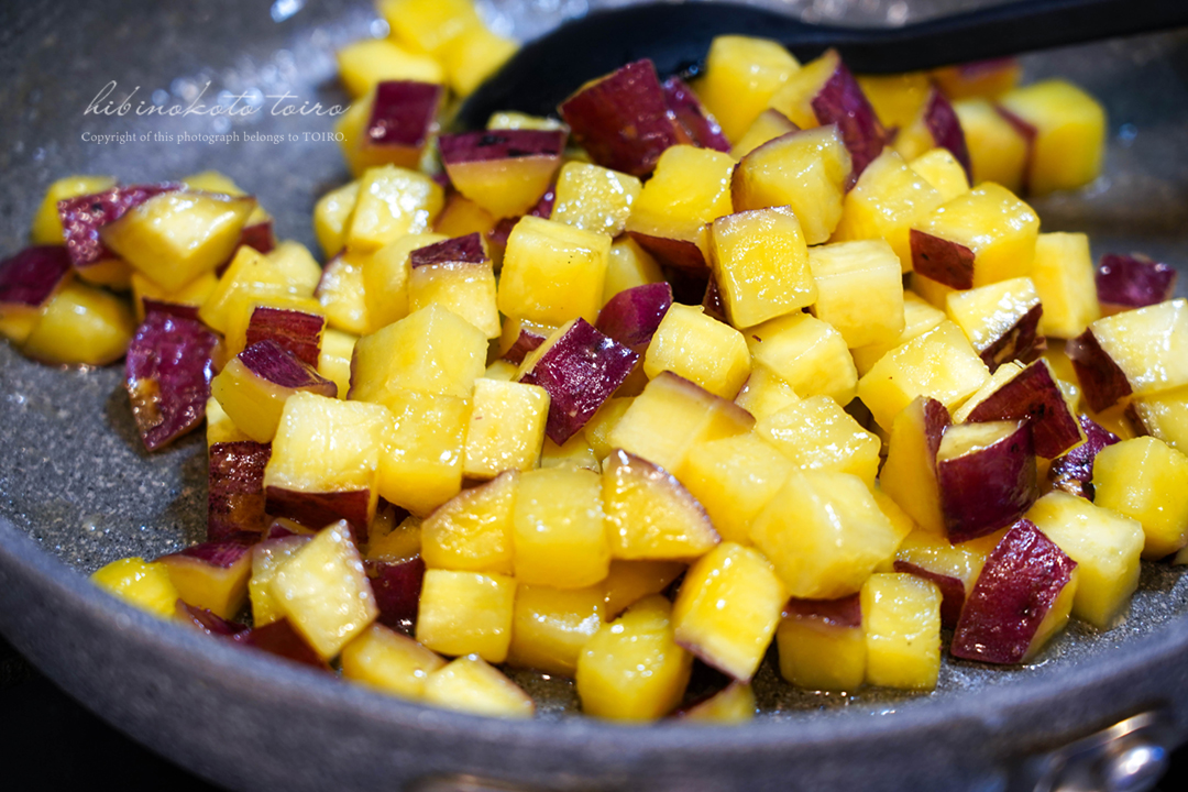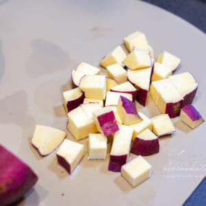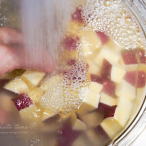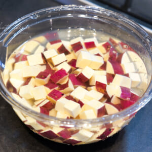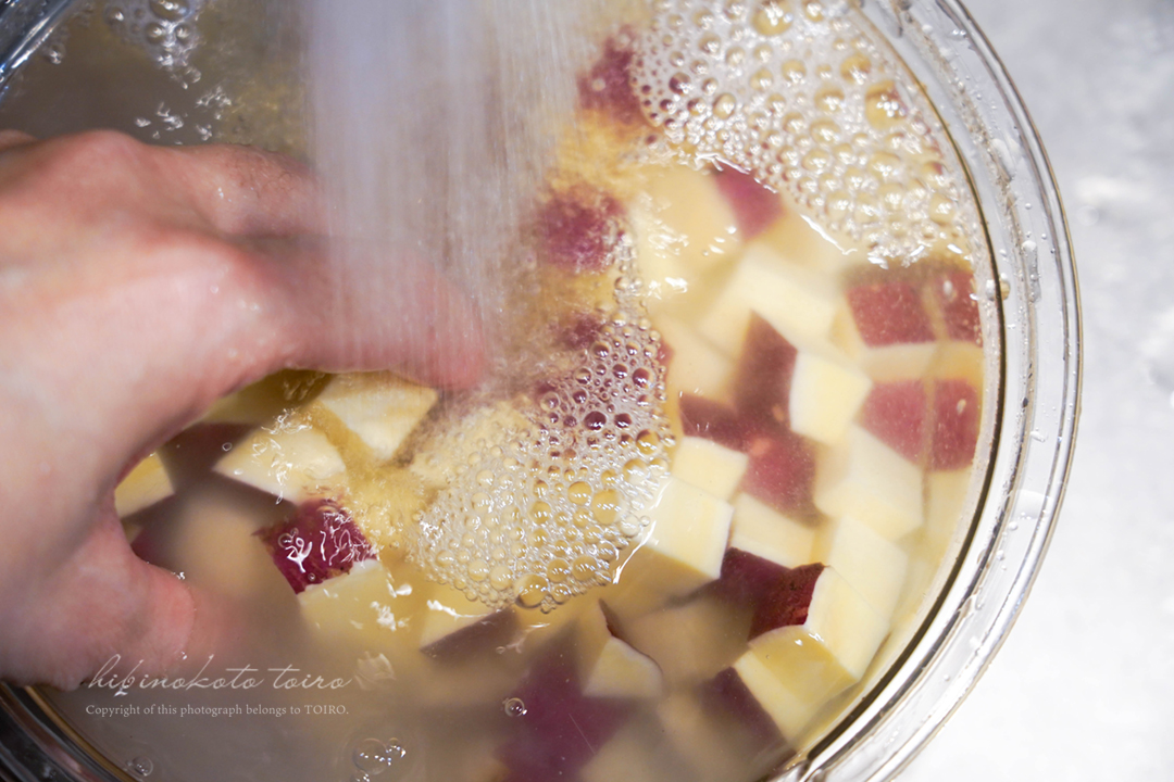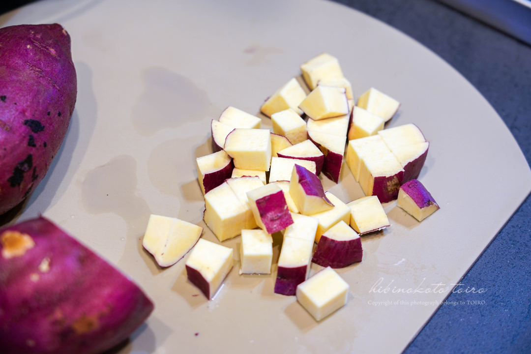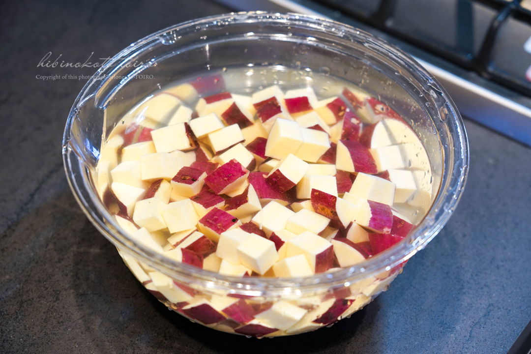 さつまいもは1.5cm角のさいの目切りにして、軽く水洗いしてから水に10分さらす(アク抜き)。
