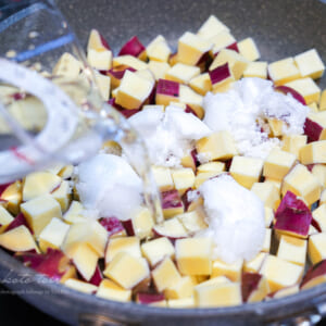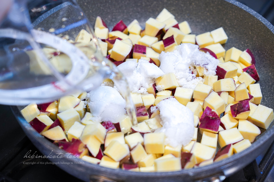 鍋に水・砂糖・塩を入れて火にかけ、砂糖が溶けたらさつまいもを加える。