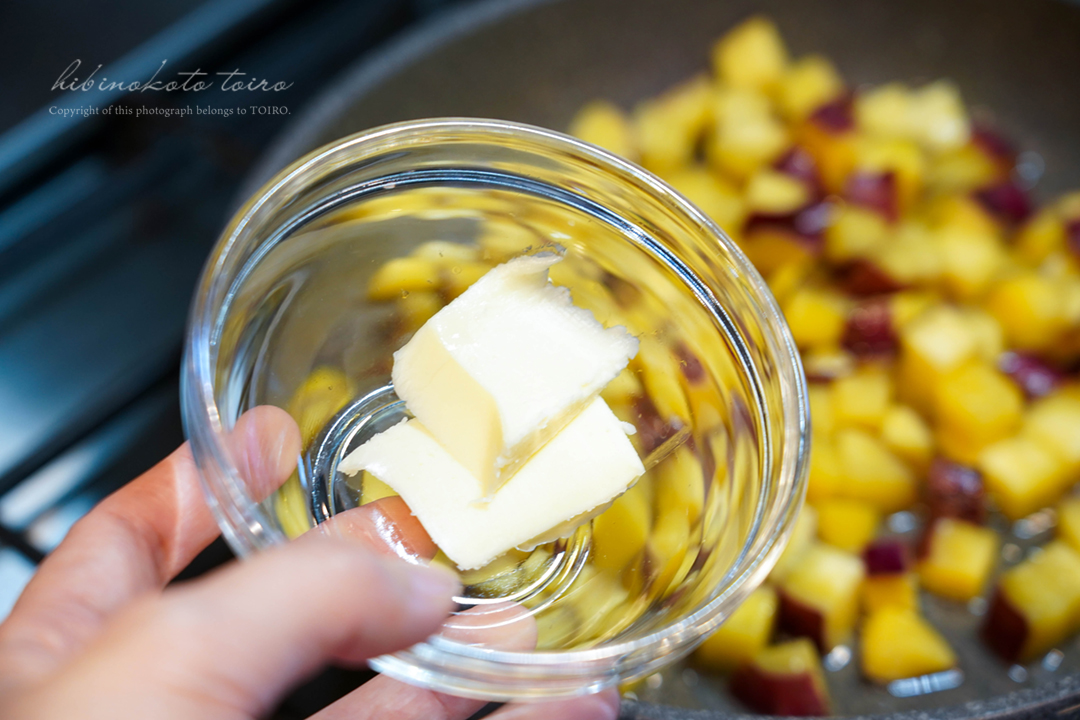 水分が少なくなってきたらバターを加え、鍋をゆすりながら全体にツヤを出す。